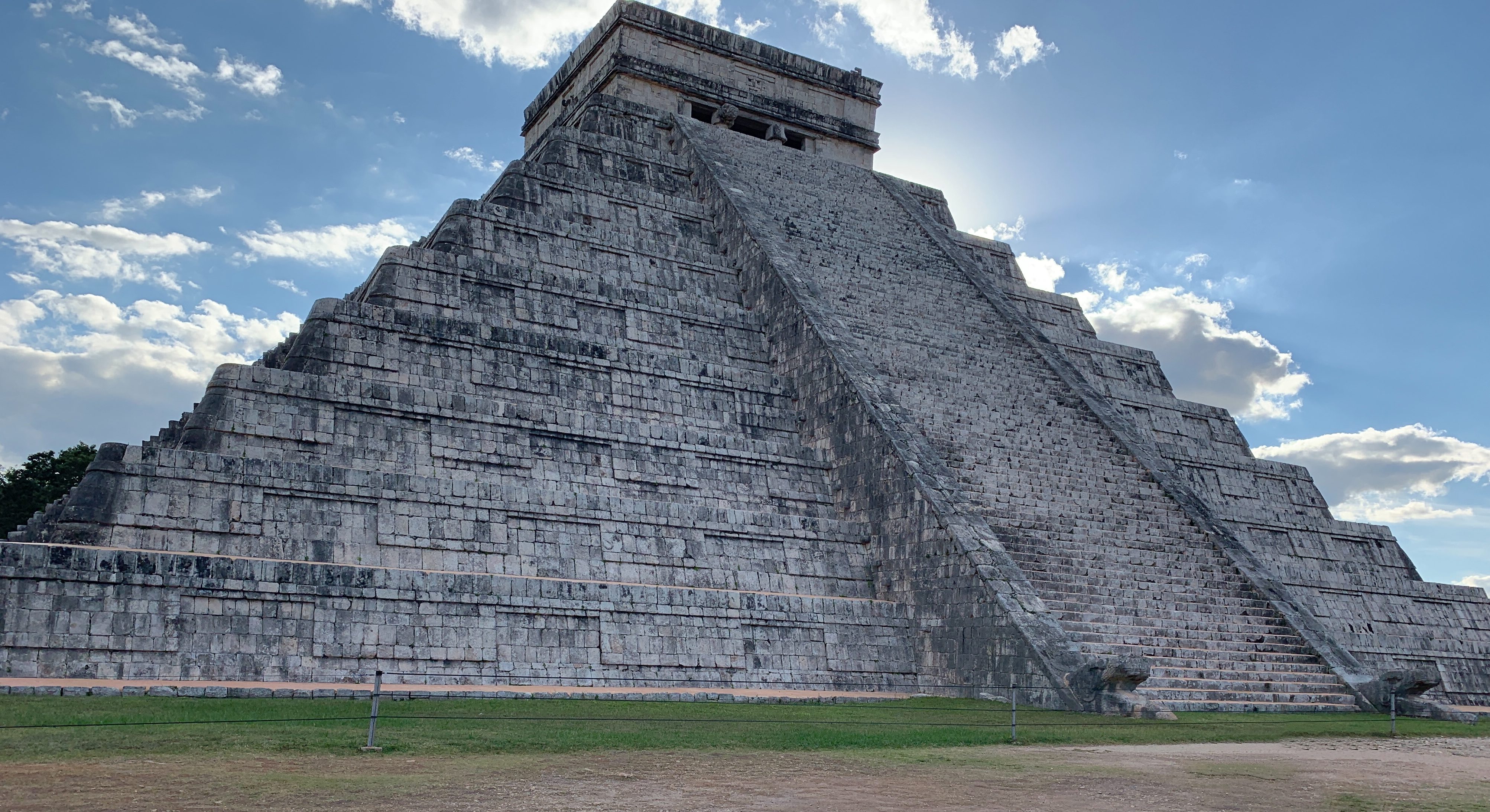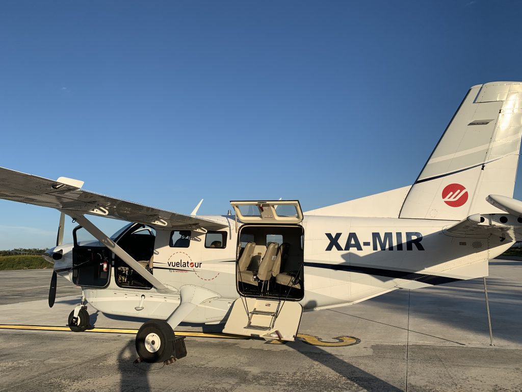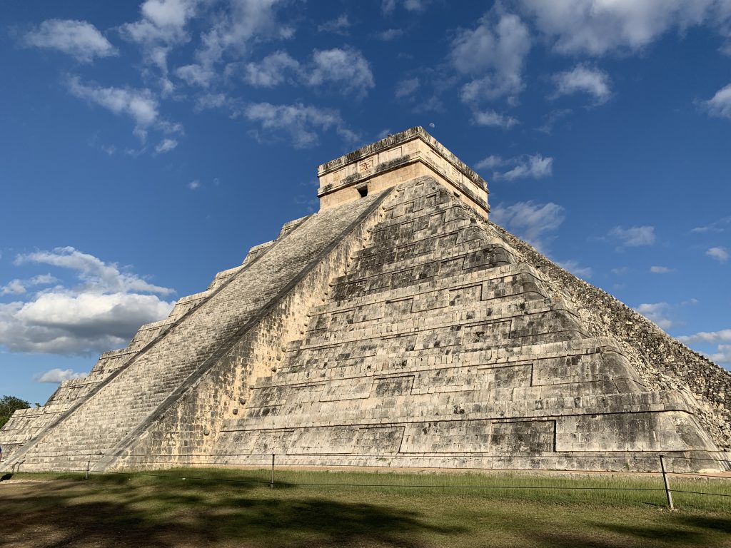 Wir legten sehr früh in Cozumel an. Da wir erst nachmittags einen Ausflug hatten, nutzten wir den fast leeren Pool und genossen die Sonne. Heute lagen sieben Schiffe vor der Küste Cozumels. Direkt neben uns lag die Norwegian Escape. Wir blickten von unserem Balkon direkt auf die gegenüberliegenden Balkone. Das Schiff hatte noch einmal zwei Decks mehr als unseres und Wasserrutschen sowie einen Kletterpark auf dem Oberdeck. Nach dem Mittag wurden wir abgeholt und mit einem Taxi zu einem kleinen Flugplatz gebracht. Insgesamt waren wir neun Passagiere, welche die kleine Maschine mitnehmen konnte. Einer wurde zum Copilot. Wir wurden nach Gewicht verteilt. Die Schweren mussten nach vorn, also saßen wir Frauen im hinteren Teil. Nach rund 30 Minuten landeten wir in Chitzén Itzá. Der Flug durch die Wolken war etwas ruckelig, aber von oben sah man gut, wie dünn das Land besiedelt ist. Am Flughafen nahm uns Ingrid, unsere Reiseleiterin, in Empfang. Sie stammt aus Österreich, lebt aber schon seit über 30 Jahren in Mexiko. Sie war unsere Reiseleiterin durch die Mayastätte. Wir hatten das Glück, dass unser Flug erst gegen 14:30 Uhr landete, so dass die Reisebusse das Gelände schon verließen. Sie benötigen noch 3 Stunden bis zu den Hotels an der Küste. Damit waren die beeindruckenden Bauten nicht zu sehr von Menschen umringt.