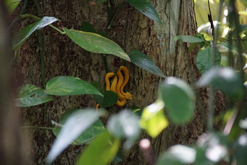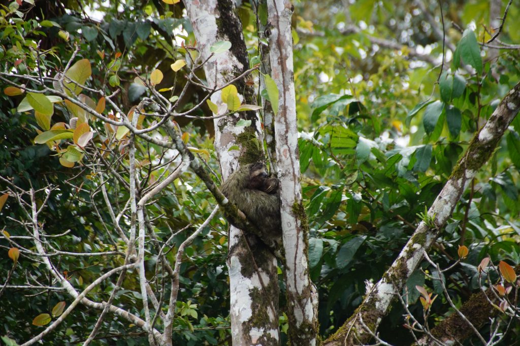 Gegen 7:00 Uhr legten wir in Puerto Limon an. In Costa Rica hatten wir einen Ausflug zum Cahuita Nationalpark gebucht. Wir fuhren mit dem Bus am Strand entlang und an Bananenfeldern vorbei. Am Morgen hatte es geregnet und so packten wir unsere Regenjacken ein, denn es ging ja auf einen Spaziergang durch den Regenwald von Cahuita. Der Name „Cahuita“ leitet sich von der Sprache der Ureinwohner ab. „CAWI“ bedeutet Mahagoni und „TA“ Spitze. Der Cahuita-Nationalpark, 43 km von Límon entfernt, verfügt über 23000 ha Meeresfläche und 1000 ha Land. In diesem Gebiet gibt es Korallenriffe, Mangrovenwälder, überflutete Wälder und tropischer Regenwald. Unsere Guides hatten gute Augen und so konnten wir den Mantelbrüllaffen, Panama Kapuzineraffen, eine giftige Bocaraca (Lanzenotter), gut getarnte Faultiere, Waschbären und Krabben sehen.