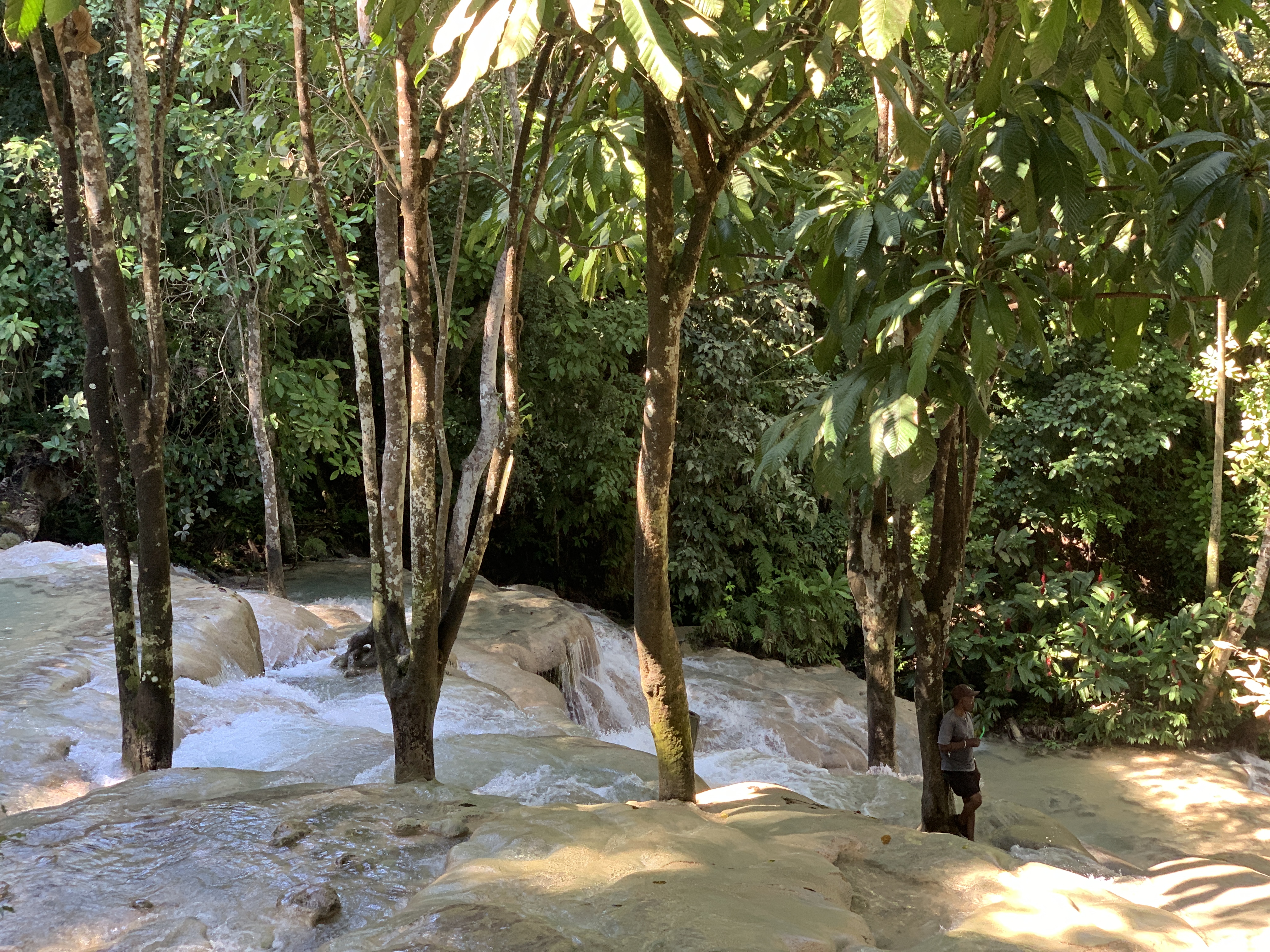 Die Straße gibt es seit 1907, als ein Erdbeben einen der acht Flüsse in der Gegend von Ocho Rios zerstörte. Das Flussbett wurde anschließend gepflastert und als Fahrbahn genutzt. Leider gab es keine Stopps, so dass man die Natur nur vom Bus aus betrachten konnte. Im Ort selbst ging es am heutigen Sonntag ganz entspannt zu. Nächster Stopp war der Dunn´s River Fall. Dieser hat eine sehr bewegte Geschichte. Es soll der Schauplatz der legendären Schlacht von „Las Chorreras“ im Jahre 1657 zwischen der englischen und der spanischen Expeditionstruppe aus Kuba gewesen sein. Die Engländer konnten die Schlacht um den Besitz der Insel für sich entscheiden. Dunn´s River Falls ist ein schnell fließender Wasserfall, der sich über mehr als 183 Meter erstreckt und ein Höhenunterschied von 50 m überwindet. Er war auch Schauplatz im James Bond Film „Die Jagd nach Dr. No“.