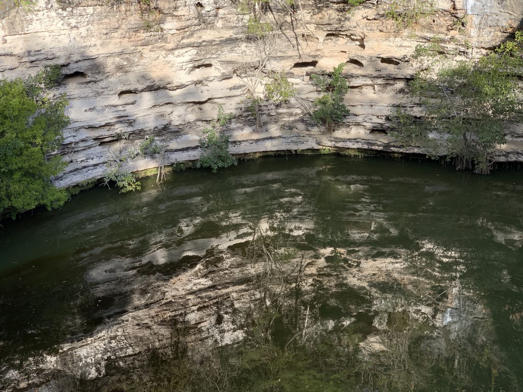 Chichén wurde um das 6. Jahrhundert n. Chr. gegründet, vermutlich von den Maya-Völkern der Halbinsel Yucatán. Es gibt Hinweise darauf, dass Chichén im 10. Jh. von Eindringlingen eingenommen, möglicherweise von den Itzá, nach denen der Ort benannt wurde. Einige Wissenschaftler glauben jedoch, dass die Itzá 200 bis 300 Jahre später angekommen war. Auf jeden Fall waren die Eindringlinge für den Bau von so bedeutenden Gebäuden wie El Castillo („Die Burg“) verantwortlich, einer Pyramide, die sich über 24 Meter erhebt über dem Main Plaza. El Castillo hat vier Seiten mit jeweils 91 Stufen und ist nach oben gerichtet. Zusammen mit dem Schritt auf der obersten Plattform ergeben diese insgesamt 365 Schritte – die Anzahl der Tage im Jahr. Während der Frühjahrs- und Herbstsonnenwende bilden dieSchatten, die von der untergehenden Sonne geworfen werden, eine Schlange, die die Treppen hinuntergeht. Ingrid erzählte uns, dass die große Pyramide eigentlich eine Burg mit einem Tempel darauf ist, also eine Art Palast. Er besteht aus einem Haufen unbehauener Steine und nur für die oberste Schicht wurden behauene Kalksteine verwendet. Die Treppen sind sehr steil, so dass man sie nicht mehr betreten darf. Der Grund dafür sind einige Unfälle. Wenn man vor der Treppe steht und in die Hände klatscht, dann hört man als Echo den Schrei des Vogels Quetzalcóatl (den Maya als Kukulcán bekannt), eine der Hauptgottheiten und dem Wappentier Mexikos. Beeindruckend war auch, dass die Mayas die Mathematik und die Astronomie beherrschten und einen genauen Kalender besaßen. In der Ballsportarena, der größten ihre Art findet man an den Mauern zwei große Ringe und man hat vermutet, dass sie wie Tore funktionierten, durch welche 4 kg schwerer Kautschukbälle geworfen werden sollten. Wahrscheinlicher ist aber, dass die Ringe mit ihrem Schatten die Zeit beziehungsweise die wichtigsten astronomischen Informationen anzeigten. Die Zuschauer standen direkt auf der Mauer am Spielfeldrand. Von hinten führte eine Treppe hinauf. Der Ballplatz ist 166 Meter lang und 38 m breit. Sechs Reliefs zeigen anscheinend die Sieger des Spiels, die den abgetrennten Kopf eines Mitglieds der unterlegenen Mannschaft halten. Auf der Plattform des Tempels der Jaguare nördlich des Hofes kann man aus 46 Metern Entfernung sogar ein Flüstern noch hören. Die meisten dieser Gebäude wurden wahrscheinlich ca. 900–1200 fertiggestellt. Chichén Itzá war lange Zeit im Dschungel verborgen geblieben und den Maya heilig. Ausgrabungen begannen erst im 19. Jahrhundert. Sehr viel weiß man nicht über diese Kultur, da nur Steintafeln und keine Schriften überliefert sind. Sie kannten auch kein Metall. Ihr Werkzeug war aus Stein und sie benutzten zum Beispiel für Messerklingen Lavaglas. Überall, so auch in Chitzén Itzá findet man Opfersteine beziehungsweise -tempel. Für die Maya war es eine Ehre Opfer zu werden, denn sie glaubten an eine Wiedergeburt als Tier etc. An den Mauern der Gebäude sieht man überall, wie noch schlagende Herzen herausgenommen beziehungsweise verspeist werden. Die Schädel der Opfer wurden auf Pfähle gesteckt und zur Schau gestellt. Auch Kinder blieben nicht verschont, so stürzte man sie in Cenoten, um den Regengott gütig zu stimmen. 1904 fand man in den Cenoten Skelette und Wertgegenstände aus Jade und Gold.