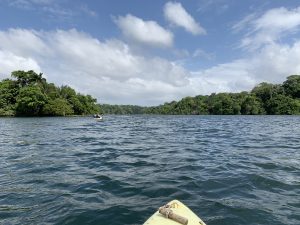Es war entspannend, denn hier gab es nicht wie im Moment am Meer, hohe Wellen. Tiersichtungen waren etwas schwierig, außer ein paar Brüllaffen und Vögeln sahen wir nur den üppigen Regenwald. Die Bäume hier sind bestimmt 30 m hoch. Kein Wunder bei dem Regen, der uns auch noch einige Male erwischte. Er war aber warm und die Sonne mit ihren knapp 30° trocknete dann alles schnell wieder. Mehr als 1 Stunde paddeln wir insgesamt auf dem Gatun See. Der See entstand während des Kanalbaus durch das Anstauen des Rio Chagres. Es dauerte 15 Jahre bis das heutige Niveau erreicht wurde. Er wird durch Schleusen begrenzt und die Fahrrinne des Panamakanals führt mitten durch ihn hindurch. Der See ist aber auch das wichtigste Wasserreservoir Panamas und ein Paradies für Angler.
